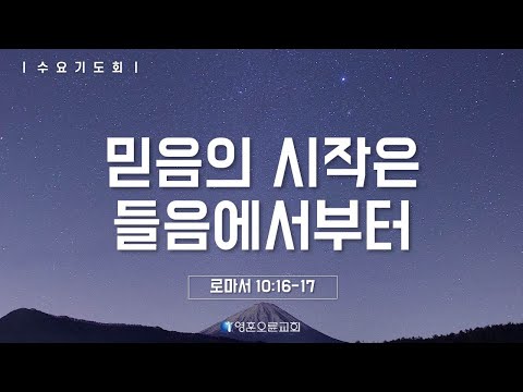 | 제목 : 믿음의 시작은 들음에서부터 본문 : 로마서 10:16-17 설교 : 유성민 목사 (롬 10:16) 그러나 그들이 다 복음을 순종하지 아니하였도다 이사야가 이르되 주여 우리가 전한 것을 누가 믿었나이까 하였으니 (롬 10:17) 그러므로 믿음은 들음에서 나며 들음은 그리스도의 말씀으로 말미암았느니라 영훈오륜교회는 하나님의 꿈이 되고, 대안이 되기 위해 오륜교회에서 '영훈고등학교'에 세우는 분립개척교회입니다. 하나님의 꿈이며, 대안인 여러분을 건강하고 행복한 영훈오륜교회로 초대합니다. 위치: 영훈고등학교 배움관(미아사거리역 6번출구) 전화: 02-945-5251 웹사이트:www.yhoryun.org 페이스북: www.facebook.com/yhoryun 블로그: blog.naver.com/yhoryun |