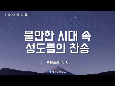 | 제목 : 불안한 시대 속 성도들의 찬송 본문 : 에베소서 1:3-6 설교 : 최수봉 전도사 3 찬송하리로다 하나님 곧 우리 주 예수 그리스도의 아버지께서 그리스도 안에서 하늘에 속한 모든 신령한 복을 우리에게 주시되 4 곧 창세 전에 그리스도 안에서 우리를 택하사 우리로 사랑 안에서 그 앞에 거룩하고 흠이 없게 하시려고 5 그 기쁘신 뜻대로 우리를 예정하사 예수 그리스도로 말미암아 자기의 아들들이 되게 하셨으니 6 이는 그가 사랑하시는 자 안에서 우리에게 거저 주시는 바 그의 은혜의 영광을 찬송하게 하려는 것이라 |
